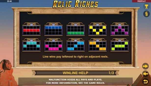 With 10 paylines, "Relic Riches" features a moderate level of winning combinations. This fixed payline structure could result in a steady stream of payouts, although the frequency and size of wins may vary. Compared to slots with hundreds or thousands of ways to win, the limited number of paylines might lead to less volatile gameplay, but could also restrict the combinations that deliver big wins.