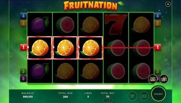 Fruitnation has a straightforward structure with only 5 paylines. This limited number suggests that the game might be focused on fewer winning combinations, potentially leading to larger individual wins rather than frequent but smaller payouts. Players should be aware that fewer paylines may mean volatile outcomes in terms of wins.