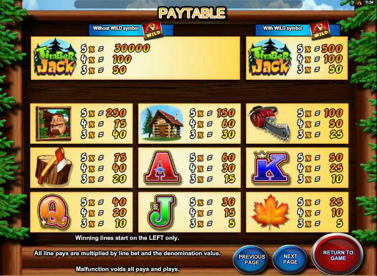Timber Jack features 30 paylines, which indicates a moderate number of winning combinations. Players can expect relatively consistent wins compared to slots with fewer paylines. However, the structure suggests a reasonable balance between winning frequency versus potential payout size.
