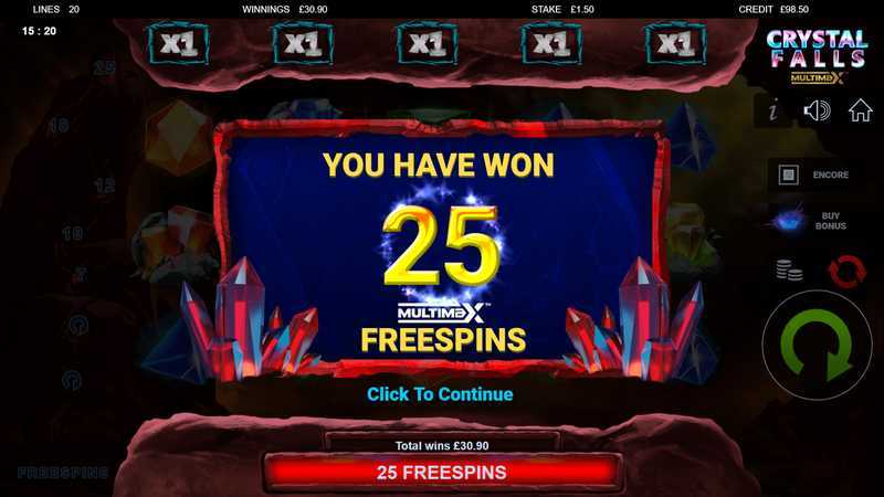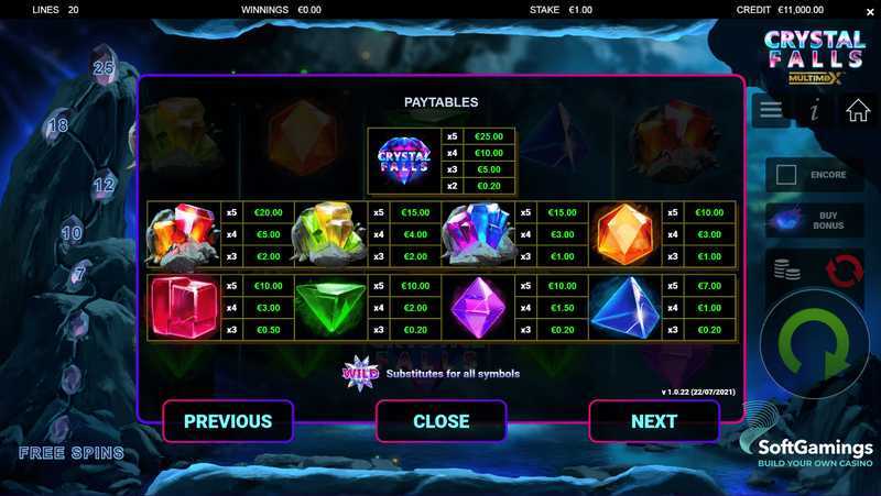 With 20 paylines, Crystal Falls Multimax offers a moderate number of winning combinations. This structure can lead to a balanced mix of frequent small wins and occasional larger payouts. The moderate number of paylines typically indicates that while wins may not occur on every spin, they are achievable enough to keep players engaged.