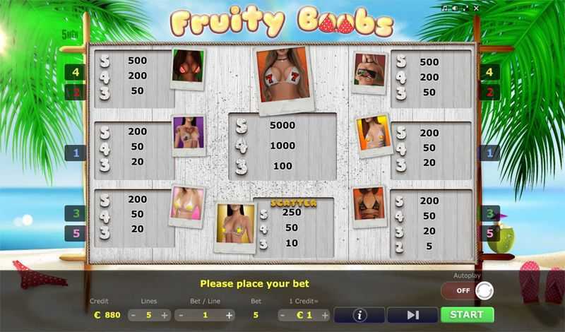 Fruity Boobs features a total of 5 paylines, suggesting a relatively straightforward winning structure. This setup may lead to fewer winning combinations compared to slots with a higher number of paylines, which typically offer more opportunities for winning. However, the fixed paylines can make for bigger payouts when winning combinations do occur.