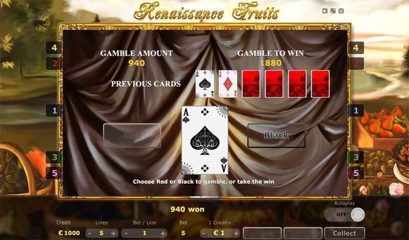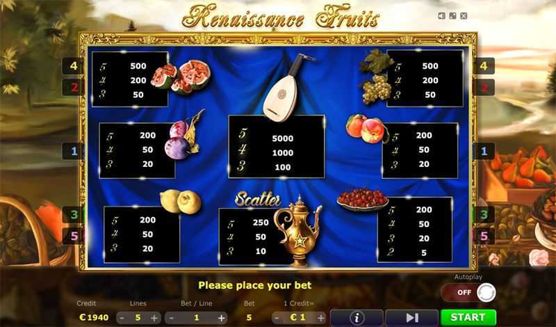 Renaissance Fruits offers 5 fixed paylines. This structure typically leads to a more straightforward payout system compared to slots with numerous ways to win. However, having only a few paylines means players rely on hitting specific combinations more often and can experience longer periods without wins, particularly during higher volatility phases.