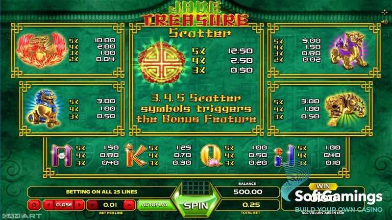 Jade Treasure offers 25 fixed paylines. This structure allows players to have a clear understanding of winning combinations, which may lead to more frequent but smaller payouts compared to games that employ more complex mechanics like "ways to win." Given the medium volatility of the game, players can expect a balanced mix of wins, maintaining an interesting gameplay experience without aggressive fluctuations.