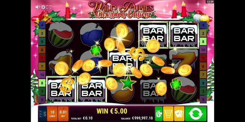 Wild Rubies Christmas Edition features a 5-reel and 3-row layout. This traditional grid format is standard in many slots and allows for straightforward gameplay and understanding of the winning combinations. Despite the limited number of paylines (10), the 5-3 arrangement can still facilitate multiple winning combinations in a single spin.