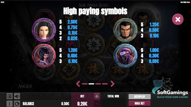 The volatility of "She Ninja Suzu" is listed as "Unknown", making it difficult to gauge the frequency of wins and how substantial they might be in relation to the bet size. However, the combination of the 20 paylines and the solid RTP suggests a likelihood of moderate returns rather than extreme volatility. This means that players may experience a balanced mix of small and medium wins over extended gameplay.