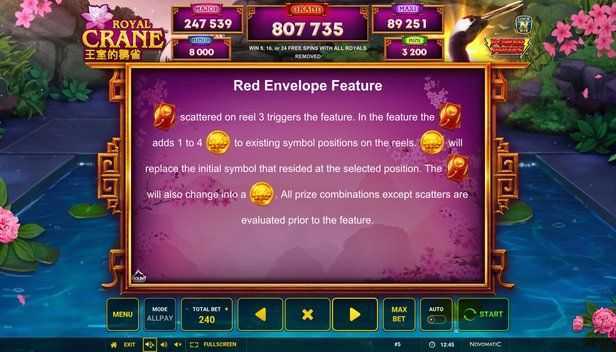 "Power Prizes Royal Crane" features a solid 95% RTP with a 5x3 grid and 243 paylines, creating decent opportunities for winning combinations. However, the high volatility does indicate that players may experience more erratic results: large wins can occur, but so can prolonged periods without payout.