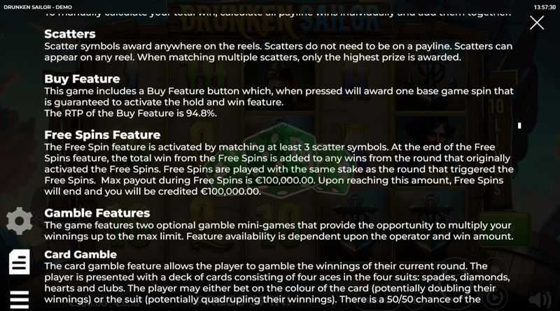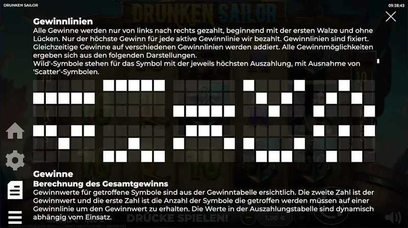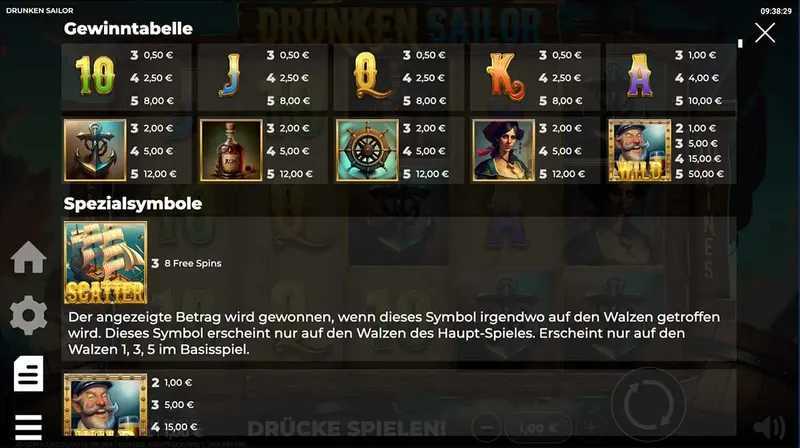 Drunken Sailor features 10 paylines, meaning there are a limited number of winning combinations per spin. This structure could lead to less frequent wins compared to slots with a higher number of paylines or "ways to win" mechanics. Players may experience a more volatile game, where wins can be substantial when they occur but potentially spaced further apart.
