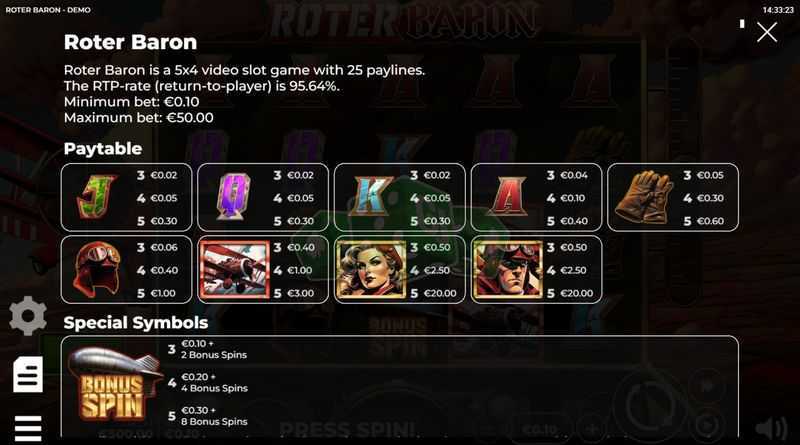 With a structure of 25 paylines, Roter Baron offers a moderate number of winning combinations. While this could yield frequent wins, the high volatility indicates that many of these wins may be smaller, with larger payouts being less frequent and more challenging to achieve.