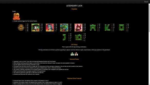 The high volatility of Legendary Luck indicates that players may experience significant fluctuations in their bankroll. High volatility slots tend to pay out larger wins but less frequently, suggesting that players could go through dry spells without significant wins. The 243 paylines** offer a broad avenue for winning combinations, but the high volatility might require a larger bankroll for sustained sessions, minimizing the risk of quick depletion of funds.