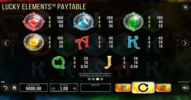 With a medium volatility classification, Lucky Elements offers a balanced gaming approach. Players can expect a mix of regular, smaller wins, along with the chance to hit larger payouts, especially with the 243 paylines providing multiple opportunities for winning combinations. Hence, this slot is suitable for players who prefer a balanced risk-reward ratio and are looking for both fun and potential profit.