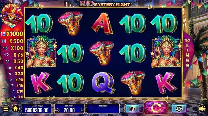 The volatility of Rio Mystery Night is classified as Medium-Low, indicating a balanced risk level. Players can generally expect regular, smaller wins with occasional larger payouts, particularly beneficial for casual players or those new to slots. The presence of 10 paylines means that while winnings may not come at a rapid pace, they could potentially be more substantial due to the structured nature of payline rewards.